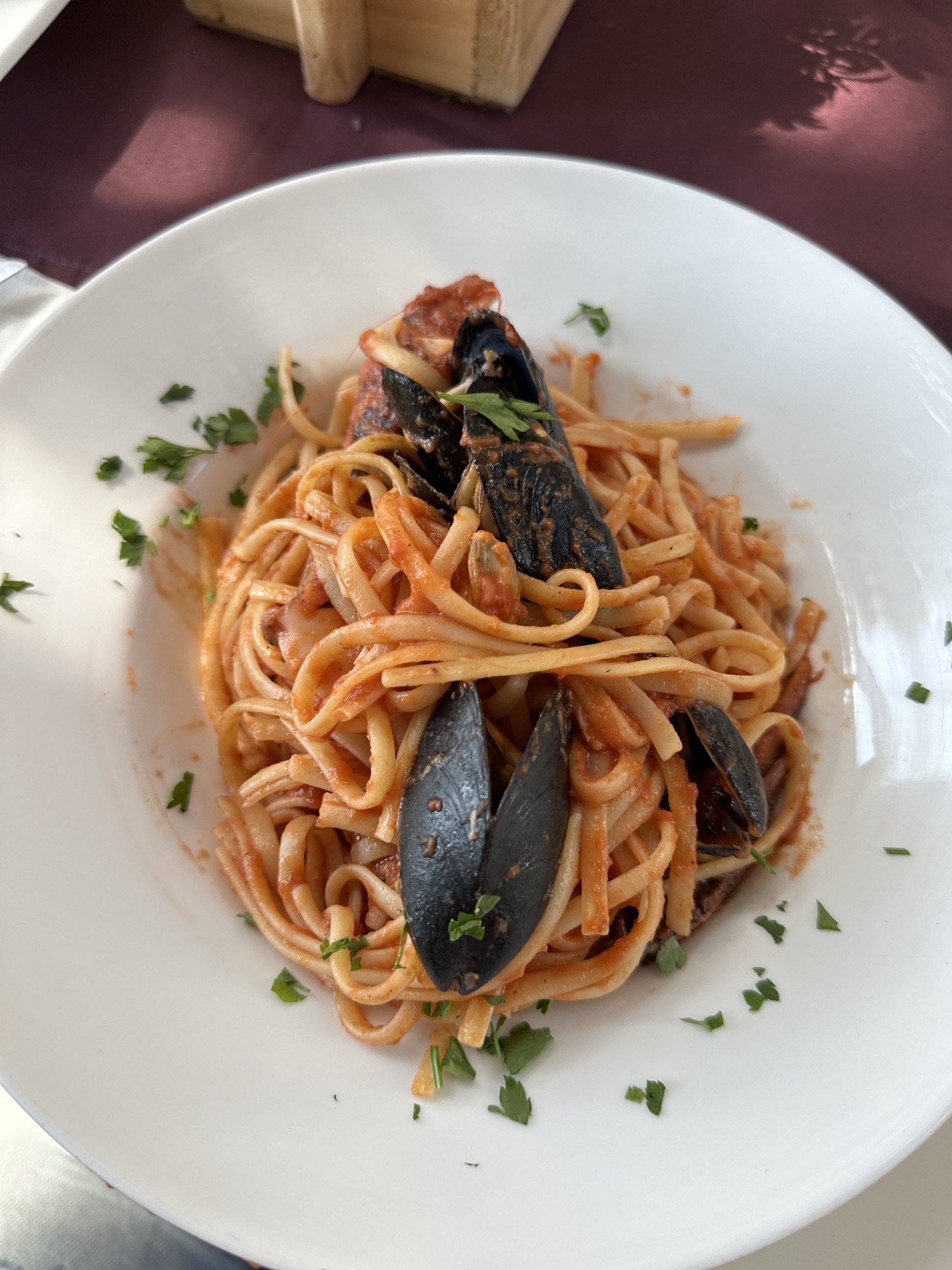 We watched the sunset over dinner at Ostro right on the water in Ksamil before heading back to Saranda and returning the car. This was one of those meals where everything just lines up perfectly; good food, great view, perfect timing on the light. One of the best evenings of the whole trip.