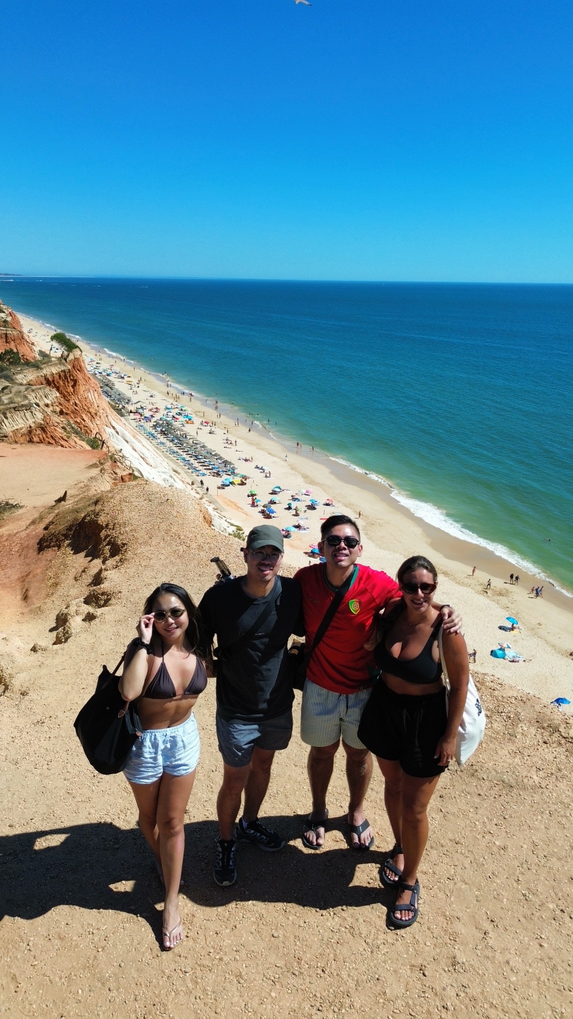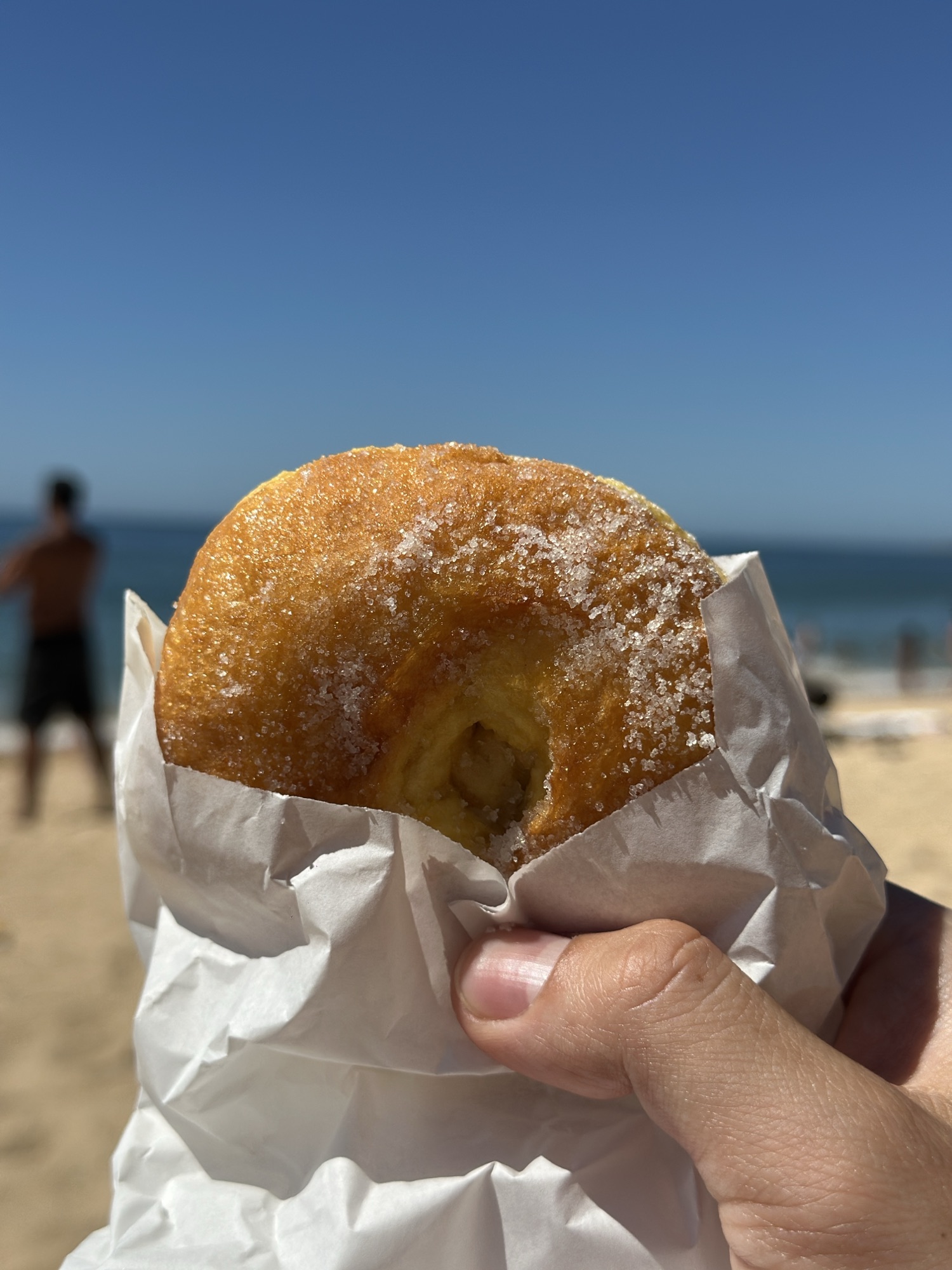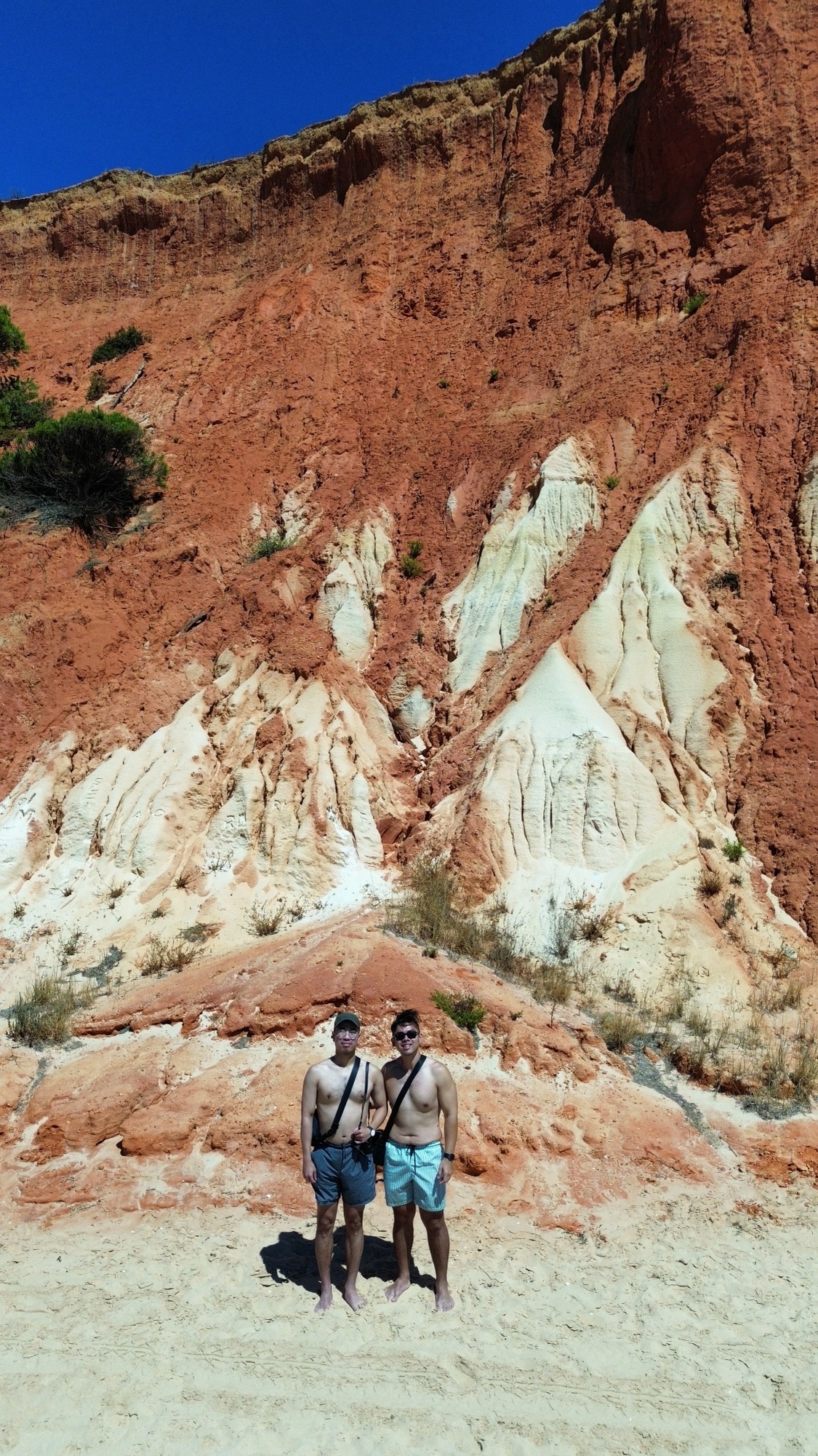 On the drive back east toward Faro, we stopped at Falesia Beach — which we’d spotted from the boat cruise the night before. The red sand cliffs are stunning and completely different from anything else we’d seen on the trip. We even had a proper Portuguese beach donut (bola de Berlim) from one of the vendors, which is mandatory if you’re at a beach in Portugal. A great way to close out the trip — one last beach, one last donut, then back to Faro to drop off the car and fly out.